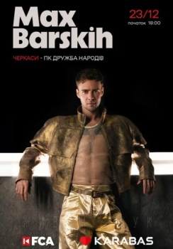 MAX BARSKIH 23 грудня 2025, 18:00 Черкаси, ПК «Дружба народів» ВАРТІСТЬ 1090 - 2390 грн КУПИТИ квиток