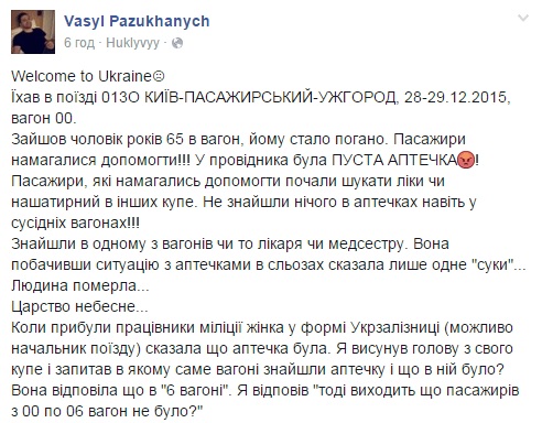 "Я позвонил в сервисный центр "Укрзалізниці", номер которого нашел в своем вагоне, и рассказал о ситуации с аптечками. Любезно женский голос заверил, что передаст просьбу "пополнить аптечки" руководству. Пусть все руководство "Укрзалізниці" подавится сверхприбылями и своим голимым чаем! Чем дальше, тем я все меньше хочу приезжать в Украину", - добавил Василий Пазуханич.