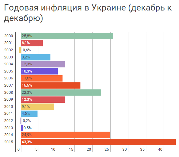 Напомним, годовая инфляция в Украине (декабрь 2015 г. к декабрю 2014 г.) составила 43,3%. Это максимальное значение за последние 20 лет. В государственный бюджет на 2016 год заложена инфляция на уровне 12%