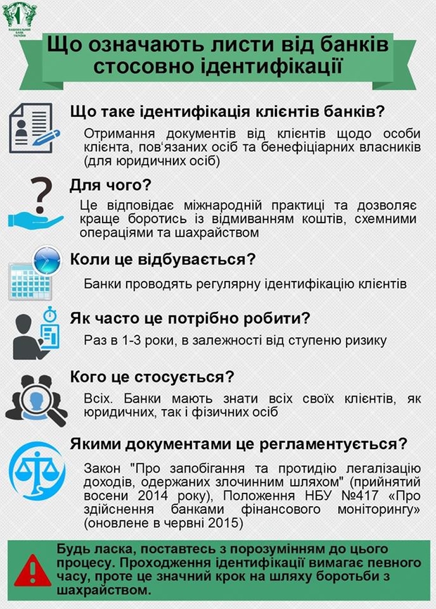 "Еще осенью 2014 года был принят Закон Украины "О предотвращении и противодействии легализации (отмыванию) доходов, полученных преступным путем, финансированию терроризма и финансированию распространения оружия массового уничтожения". Он требует от банков регулярной идентификации клиентов. Это международная практика — банки должны знать своих клиентов, как физических, так и юридических лиц. В первую очередь, это помогает в борьбе с схемными операциями и отмыванием средств", — говорится в сообшении НБУ.