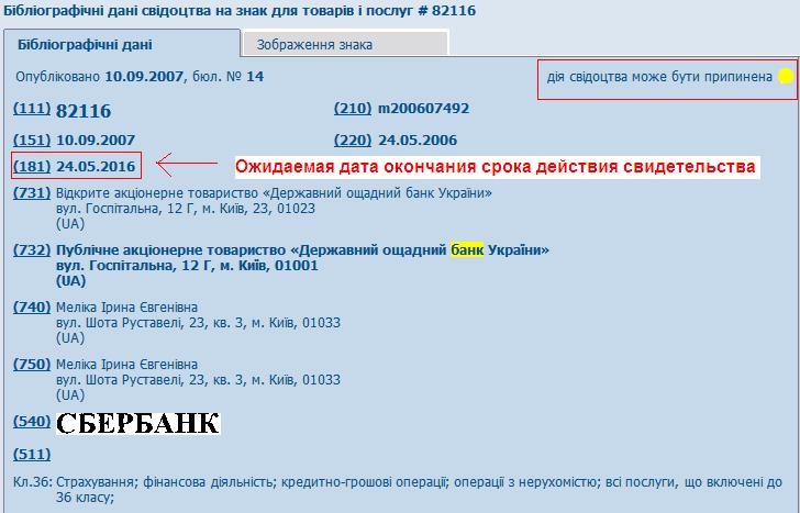 Торговая марка Сбербанк принадлежит Ощадбанку с 2007 года. Она распространяется на такие виды деятельности, как страхование и финансовые операции. Примечательно, что в реестре Госслужбы указано, что действие данного свидетельства может быть приостановлено. Ощадбанк мог не заплатить вовремя сбор за продление действия свидетельства, предполагает директор патентно-юридической компании IPStyle Мария Ортинская. Он должен был сделать это до 24 мая.