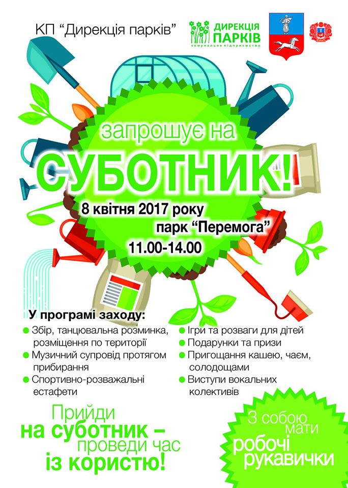 – Цього разу ініціатива проведення суботника належить нам, – розповідає директор КП «Дирекція парків» Володимир Стойко. – Ми подбали про інвентар та подарунки для учасників прибирання. Єдине, що потрібно від останніх – власні рукавички і, звісно, бадьорий настрій.