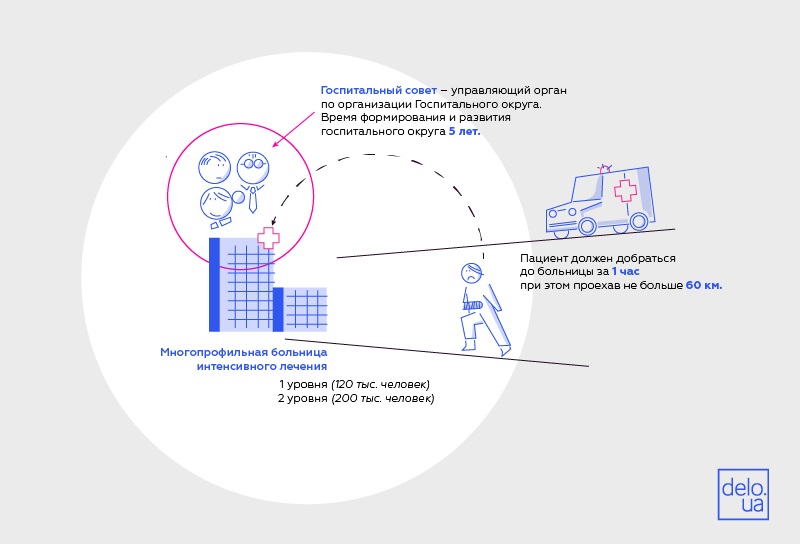 В 2017 году в Минздраве заявили, что все области необходимо поделить на госпитальные округа. Что это значит? По сути это географическое деление одной области на округа, в основе которого лежит наличие доступной больницы. В одном госпитальном округе должно находиться не менее одной многопрофильной больницы интенсивного лечения 1-го и/или 2-го уровня. Больница 1-го уровня должна обслуживать не менее 120 тыс. человек, 2-го уровня — не менее 200 тыс. человек. При этом любой человек, находящийся в этом округе, должен иметь возможность добраться до этой больницы за 60 минут, преодолев при этом не больше 60 км.
