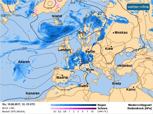 Якщо придивитися, то видно в районі Альп цяточку бузкового кольору - це навіть мокрий сніг. Ну, це високо в горах, але все ж.