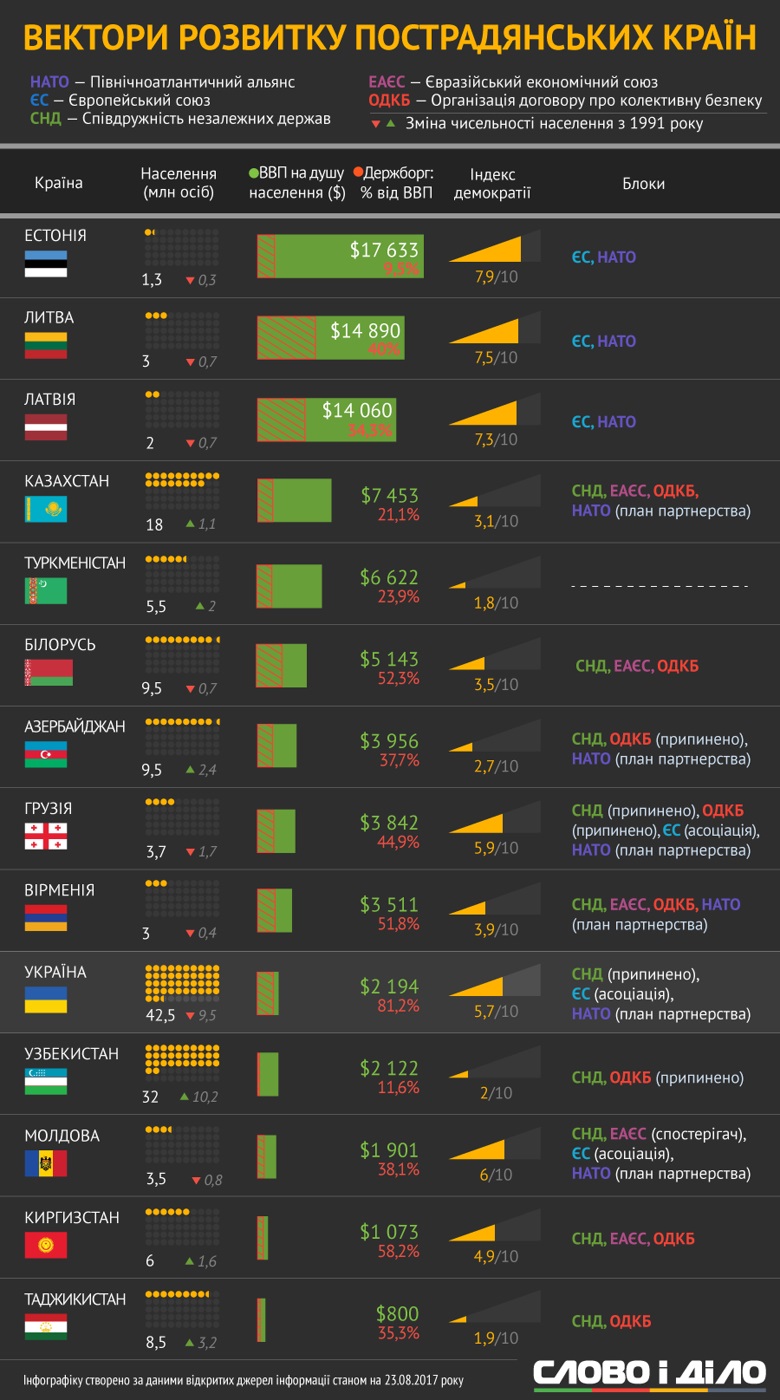 Накануне Дня Независимости Украины «Слово и Дело» подготовило сравнительный обзор бывших советских республик по векторам их развития и ключевым характеристикам политики и экономики этих стран.