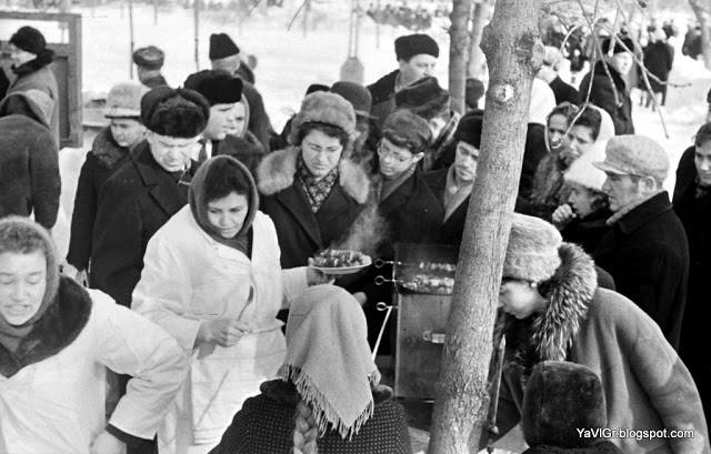 А раньше всьо було красіво… Про колективні п’янки сповіщали газети. Тоді ще й йолка біля театру не увійшла в традицію, тому народ гуляв в Первомайці (тут два фото з “Проводів Зими – 1966”, не зовсім за календарем, але для розуміння ситуації нормально) чи й даже новому Річпорту. Ну ось вам аргумент від 29 грудня 1966 року: “Шановні покупці! Вітаємо вас з Новим роком – ювілейним роком Радянської влади. Просимо не забути на Новий рік відвідати нашу ялинку в річковому порту і спробувати рибальську юшку, млинці, чебуреки та інші смачні страви. Їхати автобусом №5. Відділ робітничого постачання Черкаського річкового порту”. Всьо культурно, з централізованою доставкою.