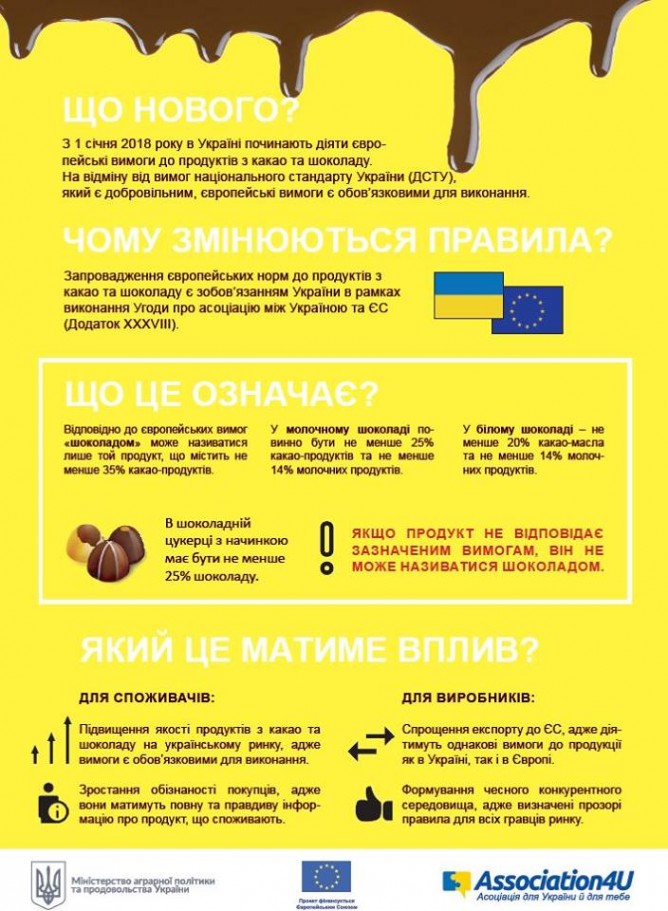 С 1 января в Украине начали действовать новые требования к изделиям из какао и шоколада, которые должны обеспечить соблюдение европейских стандартов в области безопасности и качества продуктов питания.