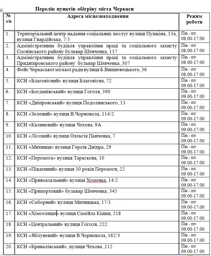 Де в Черкасах працюють пункти обігріву? (адреси)