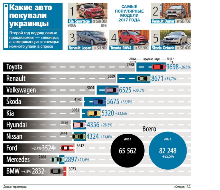 2017 року українці купили на 25% більше нових автомобілів, ніж 2016-го, підрахували фахівці “Укравтопрому”. Трійка лідерів колишня: японські, французькі та німецькі машини. А ось вітчизняних “Ланосів” купили майже вполовину менше. Експерти авторинку очікують цього року зростання продажів ще на 20% і бум попиту на електромобілі, пише Сегодня.