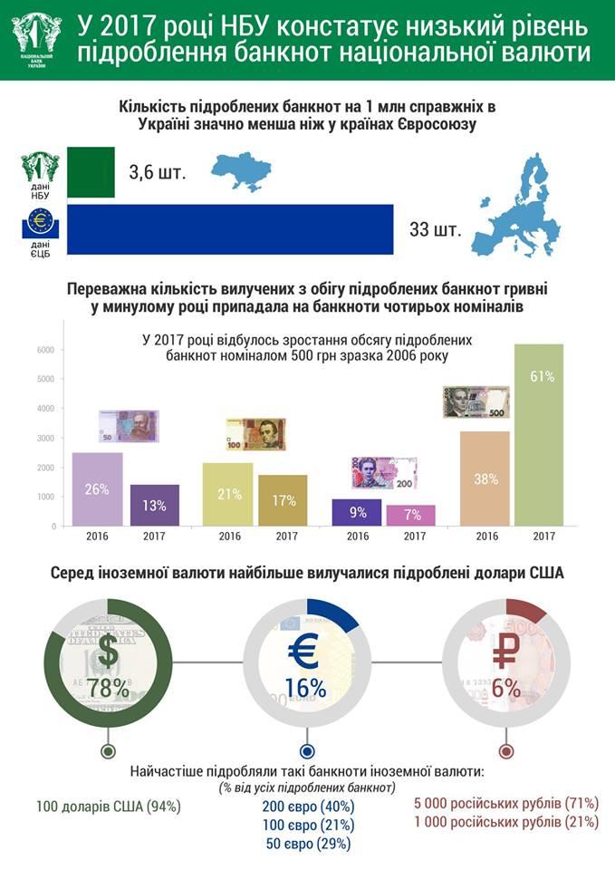 За даними НБУ, кількість вилучених з обігу в банківській системі фальшивих банкнот гривні в 2017 році становила 0,00036% загальної кількості готівки, що знаходиться в грошовому обігу.