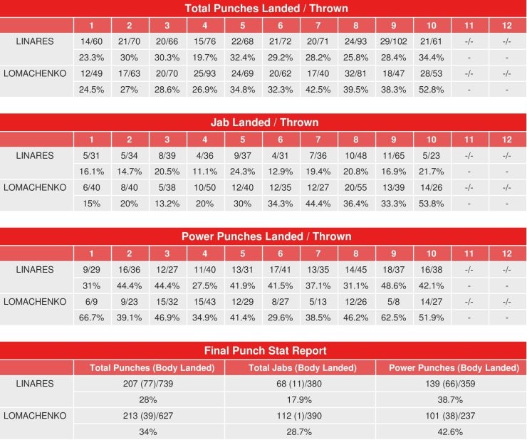 За 10 неполных раундов Ломаченко выбросил почти на 100 ударов меньше, чем Линарес, но по количеству попаданий украинец превзошел экс-чемпиона мира в легком весе – 213 против 207.