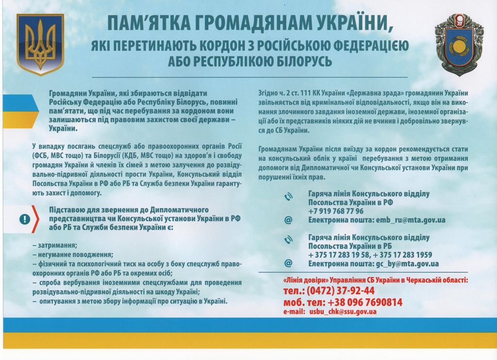 Черкаською обласною державною адміністрацією поширено пам'ятку, створену СБУ для громадян України, котрі з тих чи інших причин перетинають кордон з Росією або Республікою Білорусь.