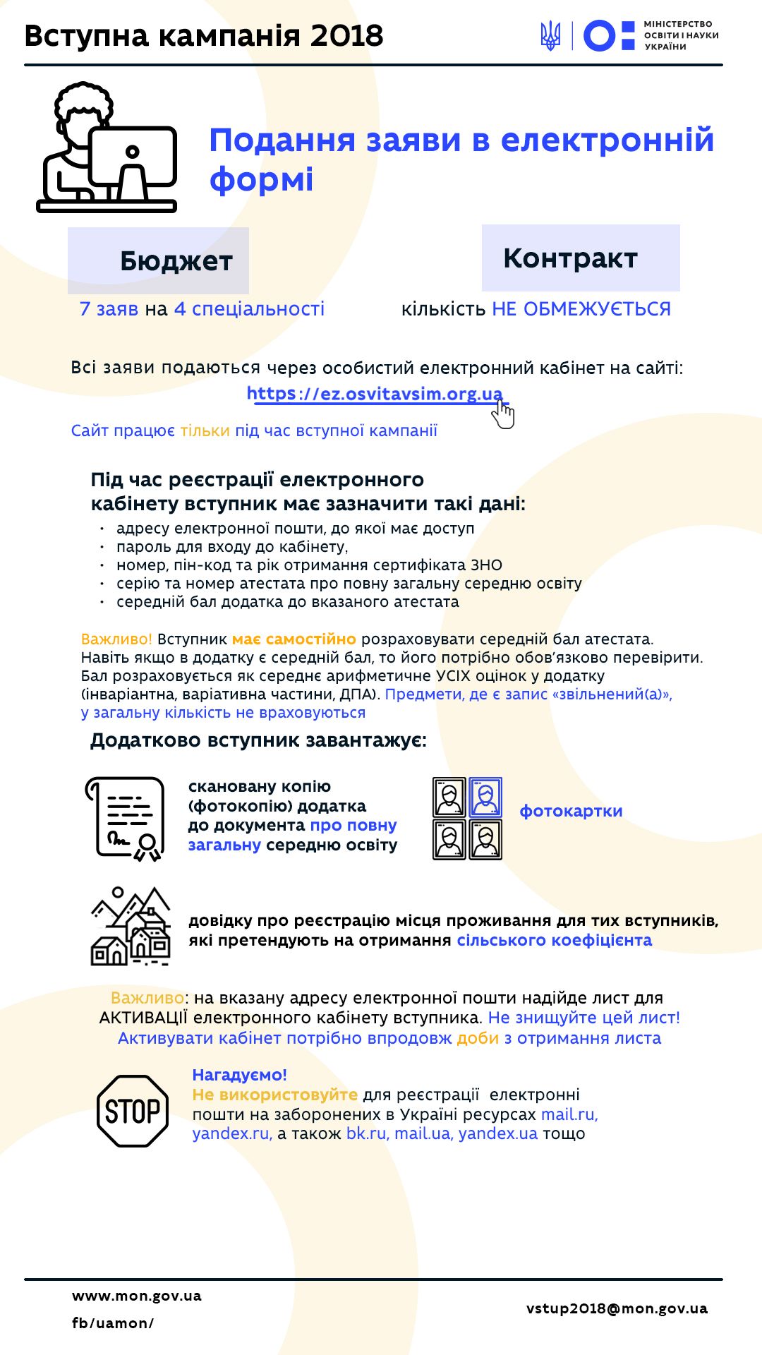 "Системою подачі заяв в електронній формі в повній мірі зможуть скористатися абітурієнти, які мають атестат про повну загальну середню освіту, виготовлений із застосуванням фотополімерних технологій, і сертифікати ЗНО 2016, 2017 або 2018 року та бажають вступити на денну або заочну форми навчання за освітнім щаблях бакалавр (магістр медичного, фармацевтичного та ветеринарного спрямувань), а також на денну форму навчання за освітньо-кваліфікаційним рівнем молодший спеціаліст", - йдеться в повідомленні.