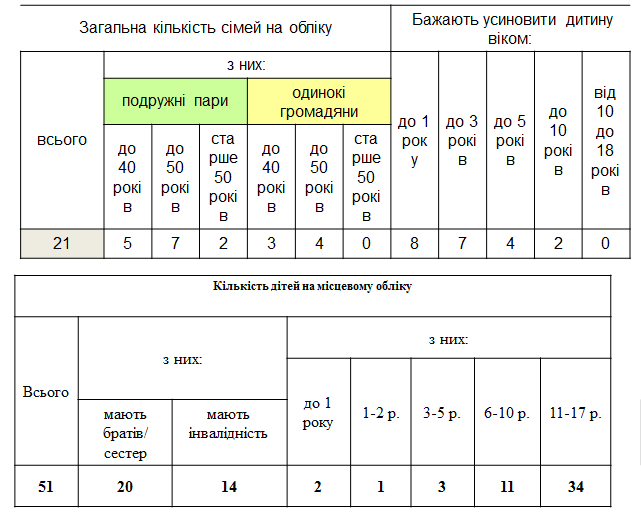 За її словами, на сьогодні на обліку перебуває 51 дитина, що потребує усиновлення, а також 21 кандидат в усиновлювачі. Для порівняння, минулоріч дітей було 56, а кандидатів в усиновлювачі – 19.