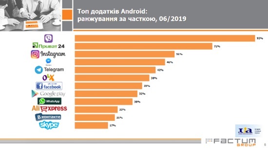Далее идет приложение для онлайн-банкинга Privat24, которое было установлено на 71% смартфонов Android. На третьем месте — Instagram с показателем 51%.