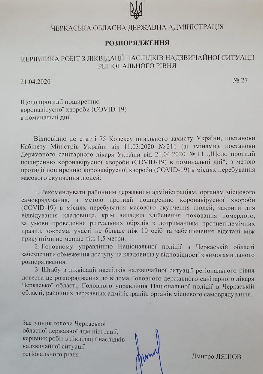 Районним адміністраціям та органам місцевого самоврядування рекомендують закрити для відвідування кладовища. Крім випадків поховання померлих, за умови дотримання протиепідемічних правил (не більше 10 осіб та з відстанню між присутніми 1,5 метра).