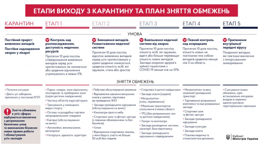 Поетапний вихід України з карантину було подано у вигляді інфографіки.