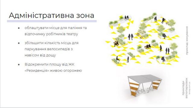 Була пропозиція проєктанта залишити зелені зони такими, якими вони є зараз (по обидві сторони драмтеатру, зі сторони вул. О. Дашковича і зі сторони вул. Симоненка). Пропозиція громадськості була врахувати стежки, якими ходять люди.