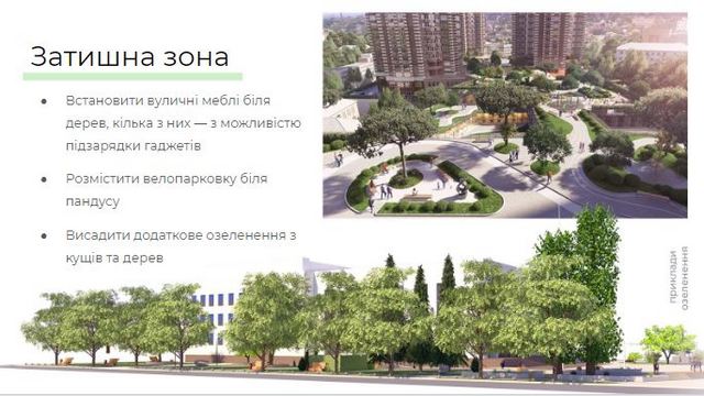 – Моя пропозиція — через ці зелені насадження зробити такі доріжки, по обидві сторони яких будуть лавочки, щоб люди могли в тіні відпочити, посидіти, почитати. Тому це дійсно слушне зауваження, яке я підтримую. Ми з проєктантом переговорили, він не проти, це не впливає на обсяги фінансування. Також ми цілком приймаємо пропозиції щодо достатньої кількості вуличних меблів, це лавочки і так далі, сучасного освітлення і можливості підзарядки гаджетів, — відзначає пан Ляшов.
