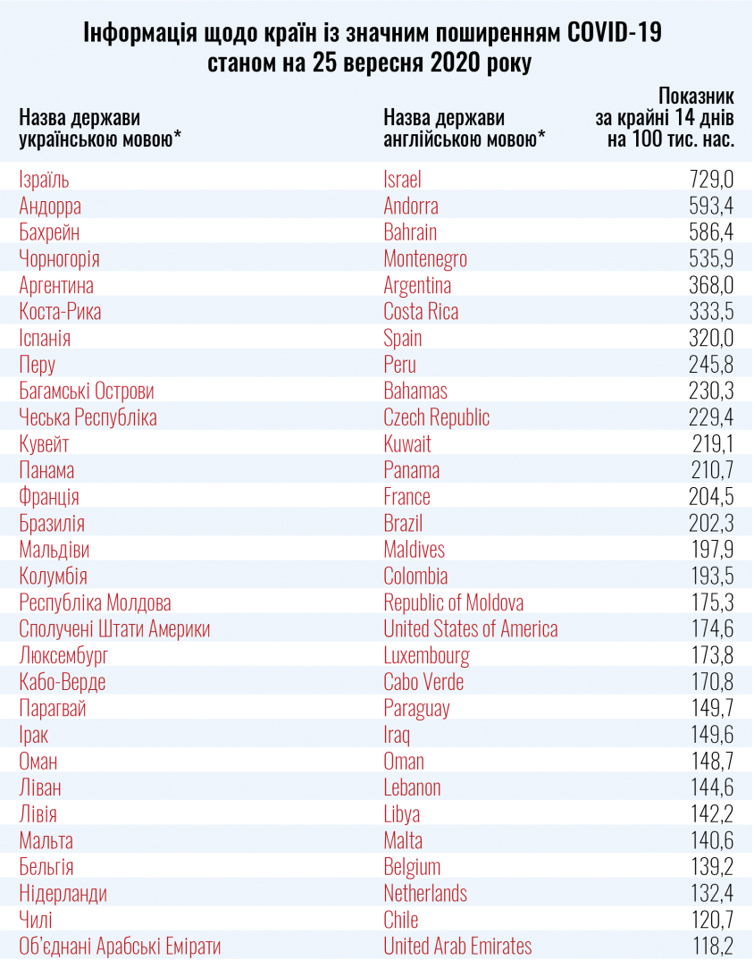 КИЇВ. 25 вересня. УНН. Міністерство охорони здоров’я України оновило список країн "червоної" та "зеленої" зон - із урахуванням кількості активних випадків COVID-19 на 100 тис. населення, передає УНН.