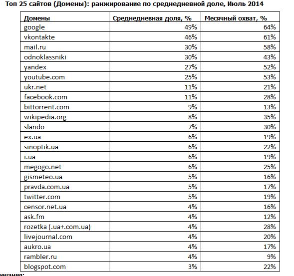 По итогам Июля 2014 г. на базе медиа-панели численностью 5 тыс. человек определен список популярных доменов, посещаемых украинскими пользователями: