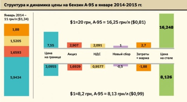 И это еще далеко не все. С января 2015 г. Кабмин под шумок принятия госбюджета-2015 ввел дополнительный 5-процентный сбор с розничного оборота подакцизных товаров, который следует перечислять в местные бюджеты. С учетом особенностей начисления этого налога к себестоимости топлива необходимо прибавить еще около 1 грн/л. Это значит, что за счет девальвации, увеличения существующих и введения новых налогов себестоимость бензина в январе 2015 г. стала выше на 50%.