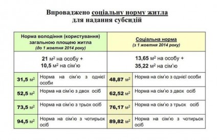 Соціальна норма володіння чи користування загальною площею житла встановлена у розмірі 13,65 м2 на кожного зареєстрованого у житлі та додатково 35,22 м2 на домогосподарство.