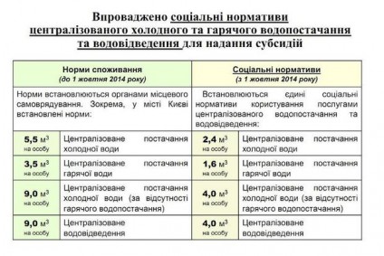 – постачання холодної води 2,4 м3 на одну особу (за наявності центр. постачання гарячої води), 4 м3 на одну особу (за відсутності центр. постачання гарячої води);