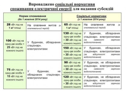 – у будинках, не обладнаних стаціонарними електроплитами 90 кВт год. на сім’ю з однієї особи + 30 кВт год. на іншого члена сім’ї (за наявності центр. постачання гарячої води),120 кВт год. на сім’ю з однієї особи + 30кВт год. на іншого члена сім’ї (за відсутності центр. постачання гарячої води).
