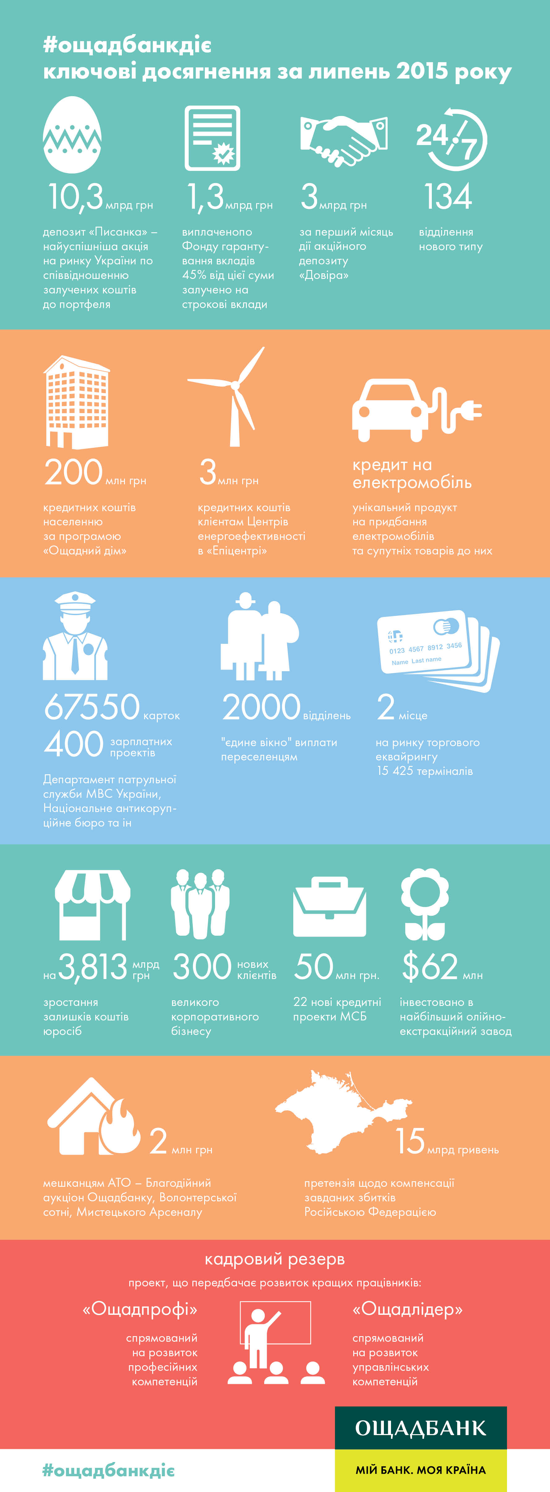 Сьогодні державний Ощадбанк є одним з рушіїв позитивних перетворень і змін, які так необхідні країні и кожному з нас. Ощадбанк змінюється, як зсередини, так і ззовні. Поліпшується якість обслуговування, оновлюються відділення, кредитується економіка. І те, що банк постійно розвивається, є, безумовно, важливим позитивним сигналом для його клієнтів. На підтвердження цих слів наведемо деякі ключові досягнення Ощадбанку у липні 2015 року.