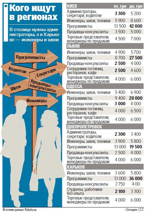 Вопрос зарплаты для соискателей на фоне инфляции, роста курса доллара и снижения уровня доходов — весьма болезненный. И здесь людей трудно порадовать денежными предложениями от работодателей. Так, зарплаты, в зависимости от специальности и города, предлагают разные: к примеру, водители в Киеве могут рассчитывать на 3300—5200 грн, а в Днепропетровске — на 2300—3400 грн. Что касается продавцов, то им в столице предлагают 2500—4000 грн, а в Харькове даже немного больше — 2750—4000 грн.