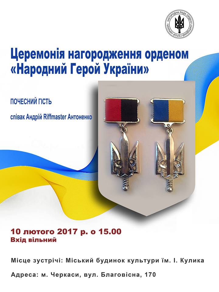 Церемонія Нагородження орденом "Народний герой України",відбудеться 10 лютого у міському будинку культури ім.І.Кулика, який розташований за адресою: м.Черкаси, вулиця Благовісна, 170, о 15.00. Вхід вільний. Чекаємо усіх.