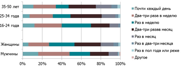 Представители средней возрастной группы (от 25 до 34 лет) являются клиентами точек фаст‐фуда 2‐3 раза в месяц.